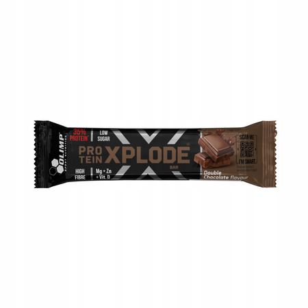 Olimp PROTEIN XPLODE BAR *Wysokobiałkowy baton (35% białka) o smaku czekoladowym w czekoladzie (19%). Zawiera substancje słodzące. Z niską zawartością cukrów. Z wysoką zawartością błonnika pokarmowego.